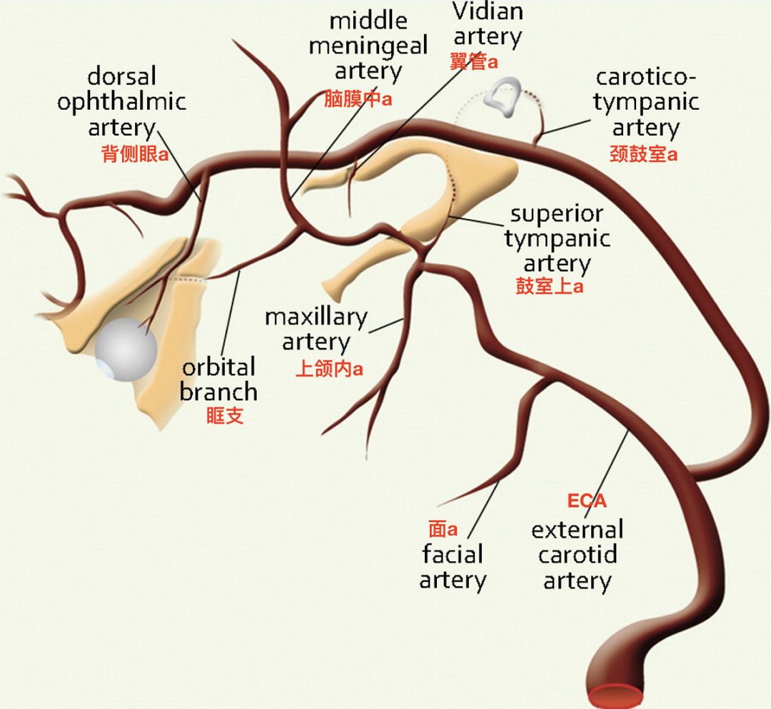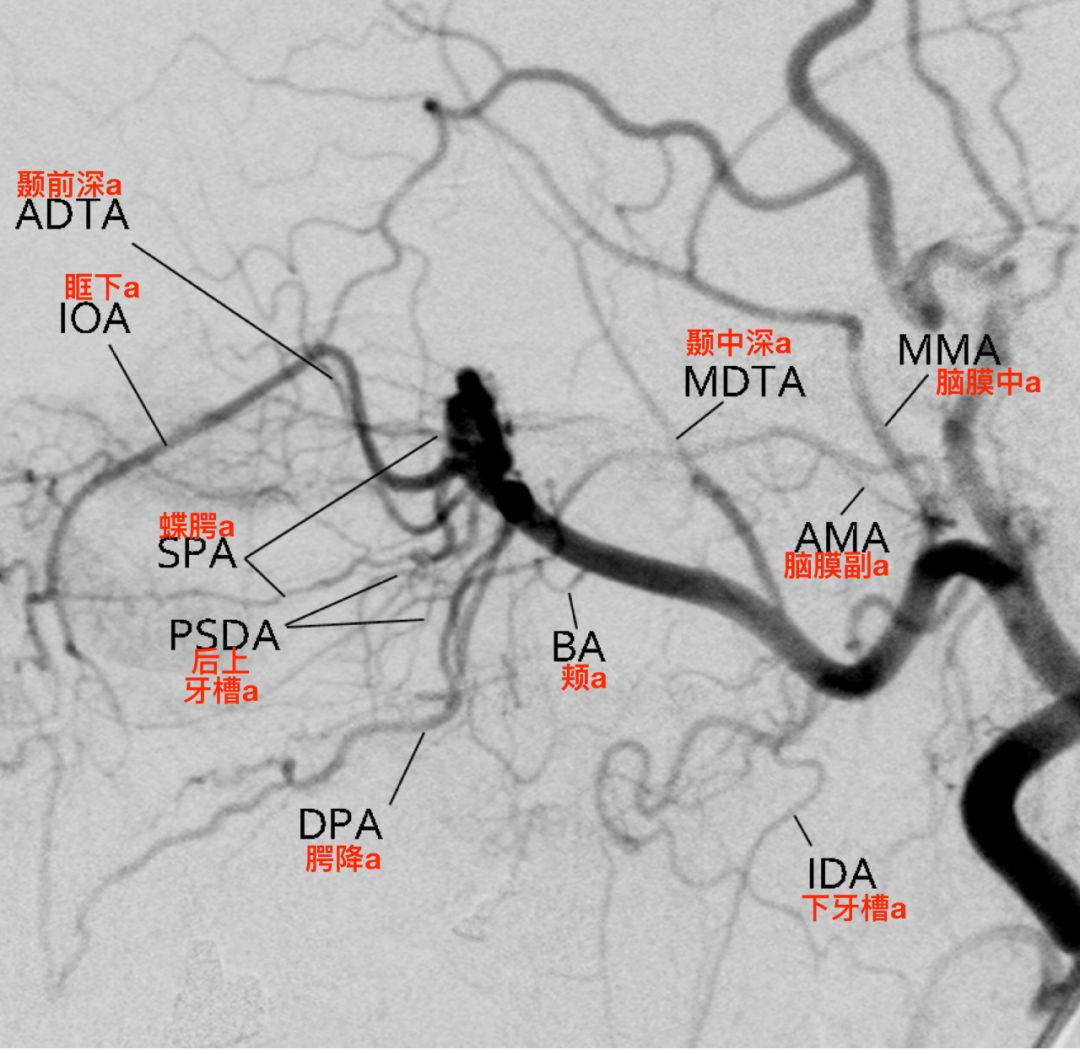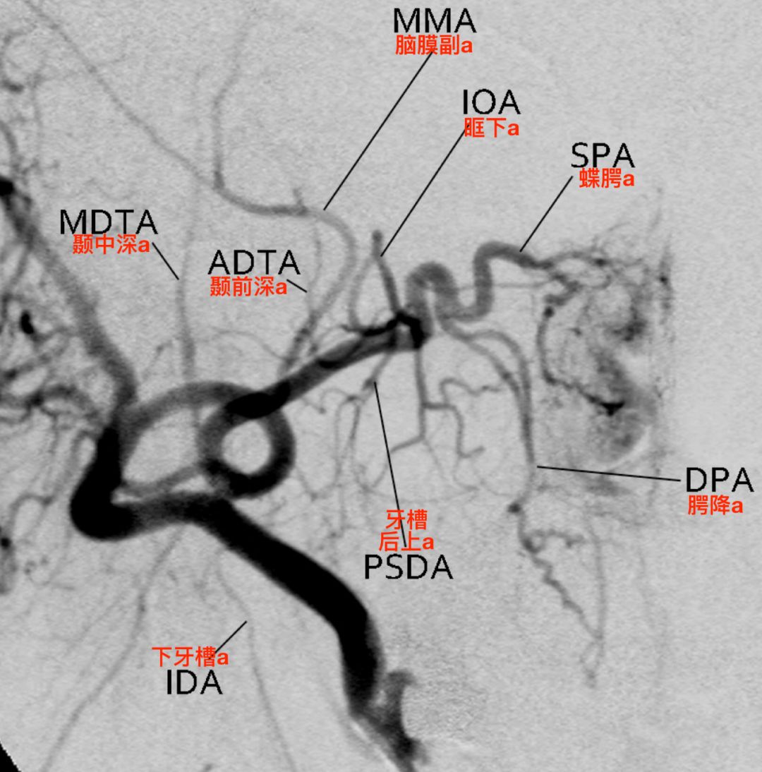 右侧颈外动脉造影,正位,显示上颌内动脉的三段及分支(Tanoue 2013)。