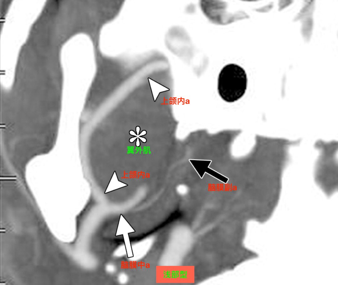 CTA,浅部型,上颌内动脉走行于翼外肌浅面,脑膜中动脉和脑膜副动脉共干发出(Tanoue 2013)。