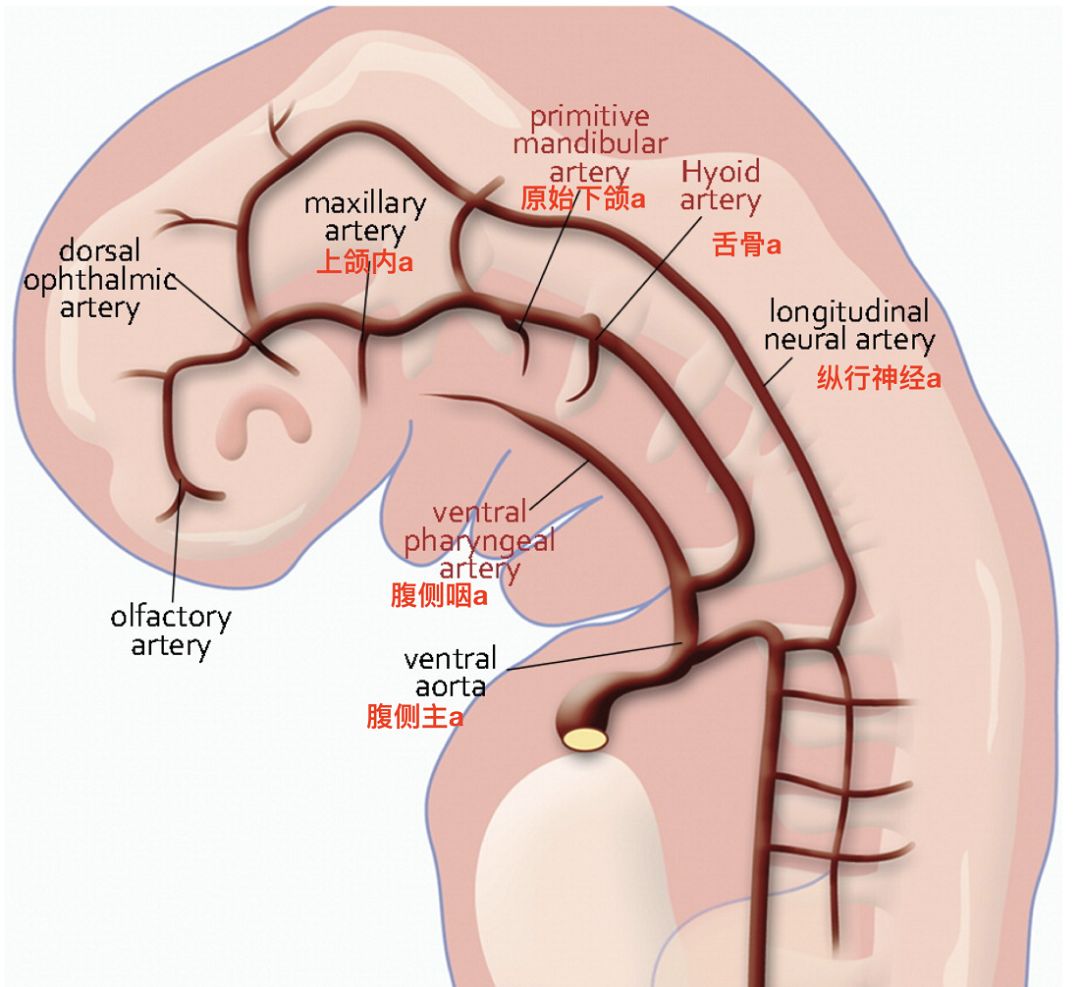 腹侧主动脉的近端和第三主动脉弓发育成颈总动脉。腹侧主动脉远端残端称为腹侧咽动脉(ventral pharyngeal artery),最后由它发育成颈外动脉。