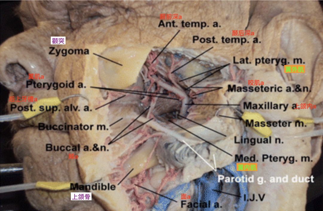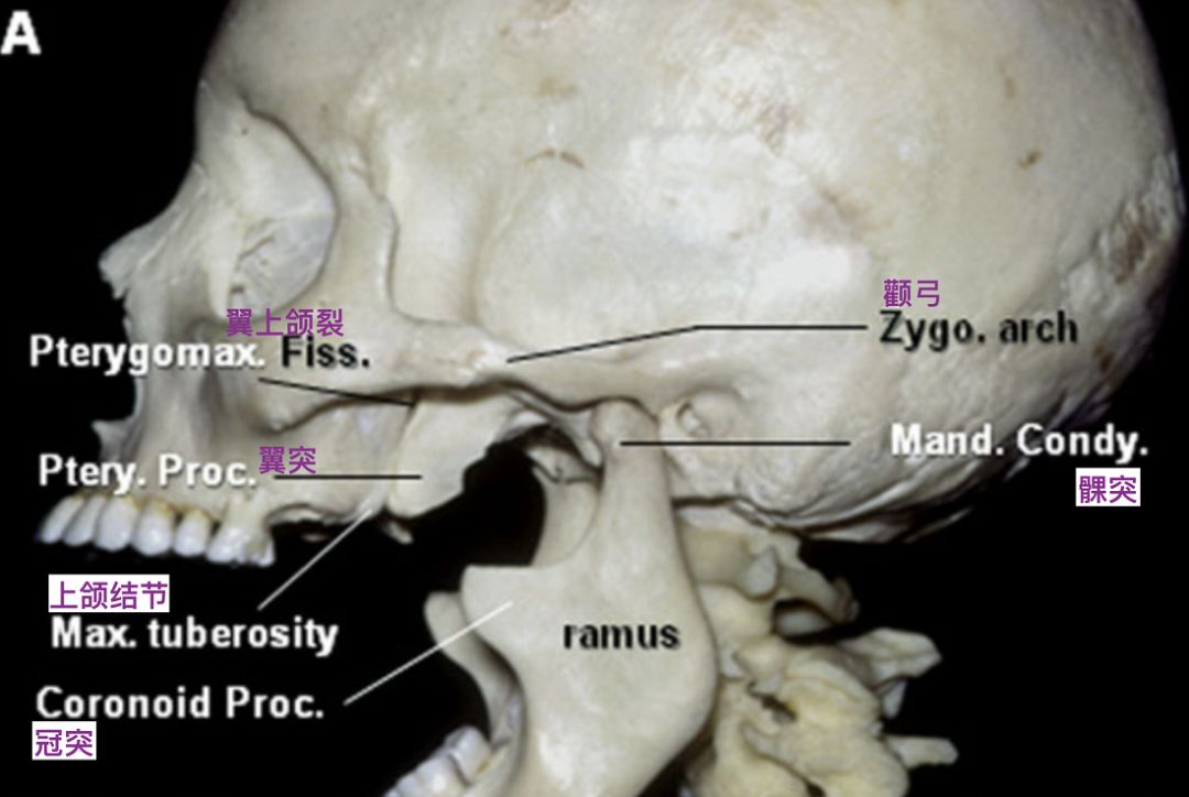 颞下窝的外侧观(Joo 2013)。颞下窝的前壁由上颌骨的后面构成颞下窝的内侧壁,前部是蝶骨翼突外侧板,更后内侧是咽、腭帆张肌和腭帆提肌。颞下窝的外侧壁由下颌支的内侧面组成。可见眶下裂和翼上颌裂。