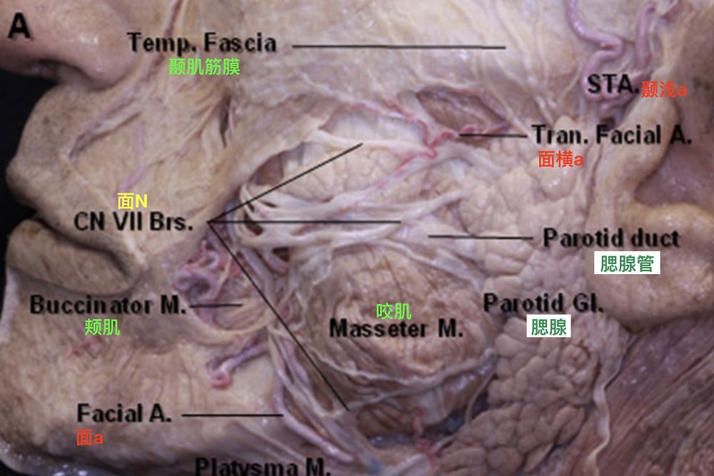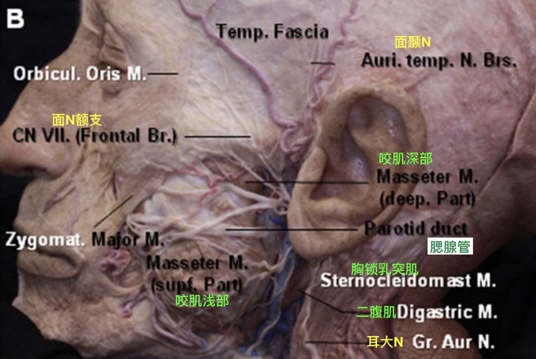 皮肤和皮下组织切除以显露腮腺以及其深面走行的供应面部肌肉的面神经分支(Joo 2013)。
