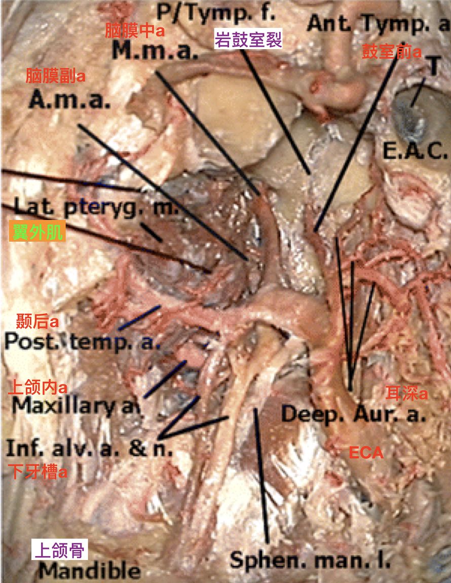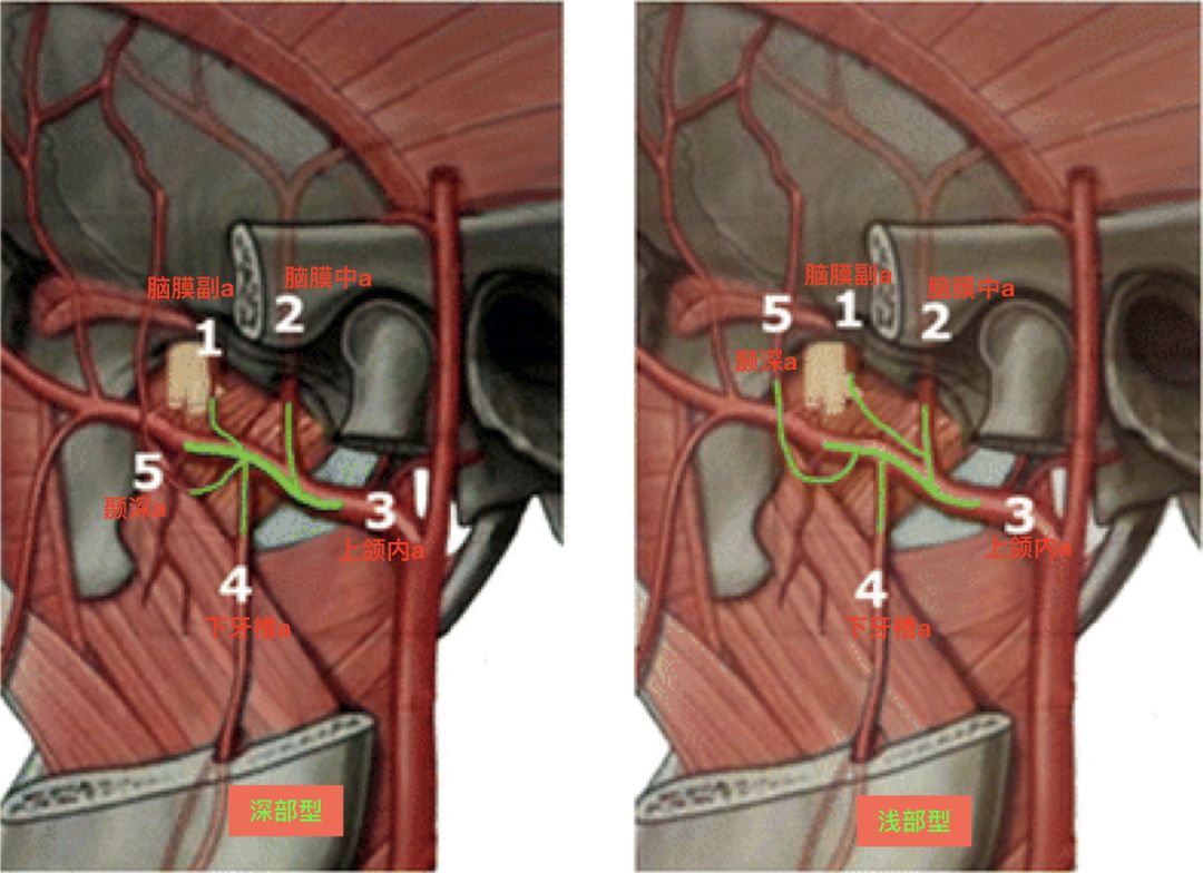 在浅部型中,脑膜中动脉和脑膜副动脉共干,而下牙槽动脉和颞深动脉分别从上颌内动脉上发出。在深部型中,下牙槽动脉和颞深动脉共干,而脑膜中动脉和脑膜副动脉分别从上颌内动脉上发出。