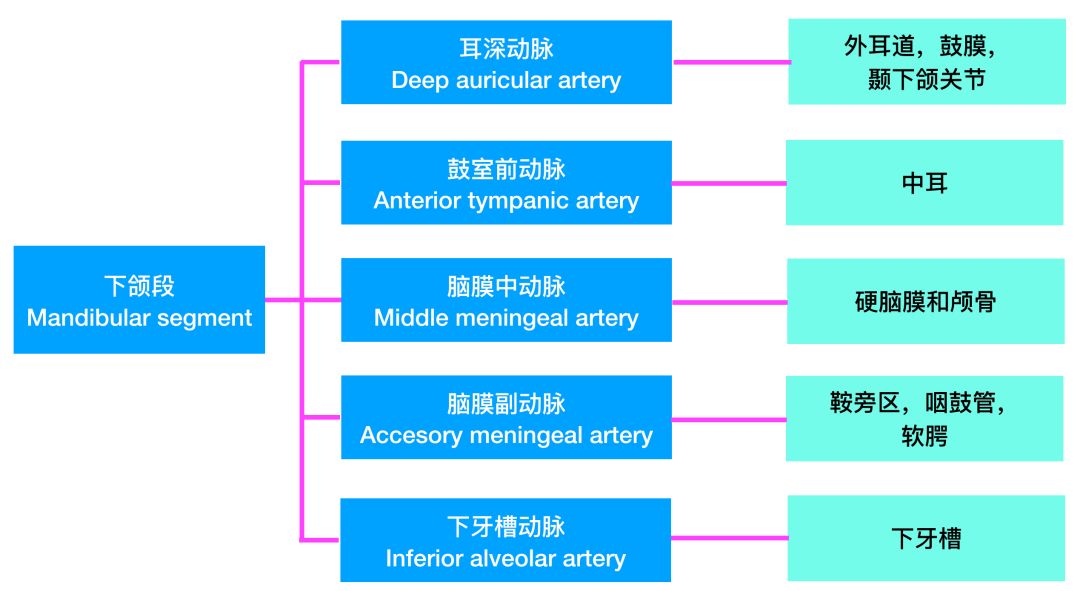 上颌内动脉第一段主要分支以及供血区(Alvernia 2017)。
