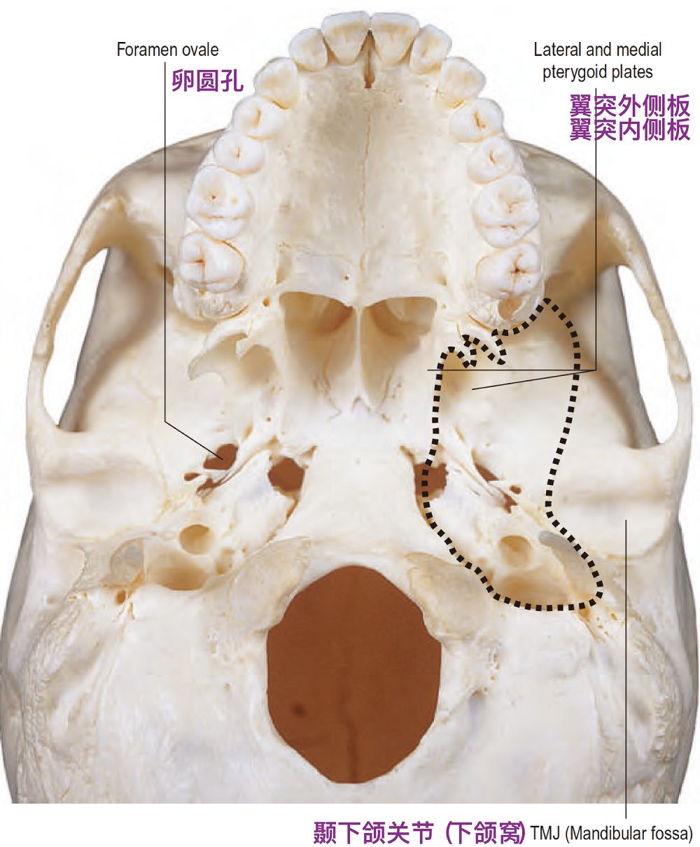 从下方看颞下窝的顶(Standring, 2016)。颞下窝的范围由虚线标识。翼突外侧板和咽鼓管构成颞下窝的内侧壁,颞下颌关节构成颞下窝的外侧壁。颈动脉孔和颈静脉孔位于扩大颞下窝后部。