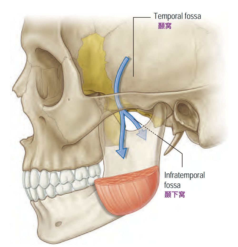 颅面部骨外侧观,显示颞窝和颞下窝的关系(Standring, 2016)。箭头是颞窝底向内侧与颞下窝相通,向外侧与咬肌区域相通。