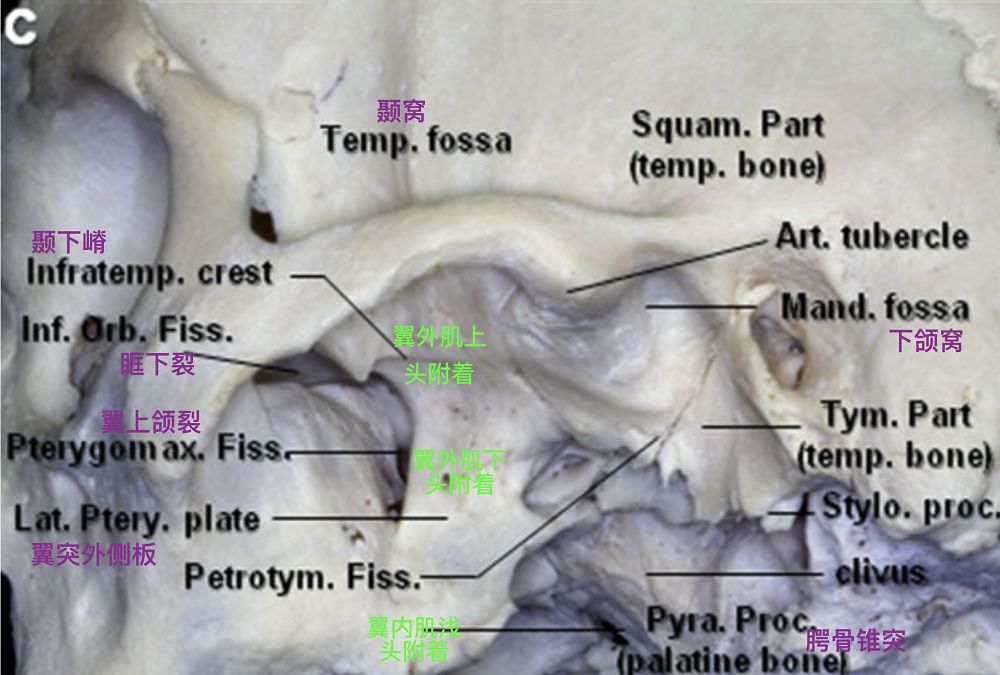 颞下窝的外侧观(Joo 2013)。着重强调翼外肌上头和下头的附着处和翼内肌浅头附着处。翼外肌上头起自蝶骨大翼的颞下面和颞下嵴,下头起自翼突外侧板的外侧面。翼内肌深头附着于翼突外侧板的内侧面,浅头附着于上颌骨结节和腭骨锥突。