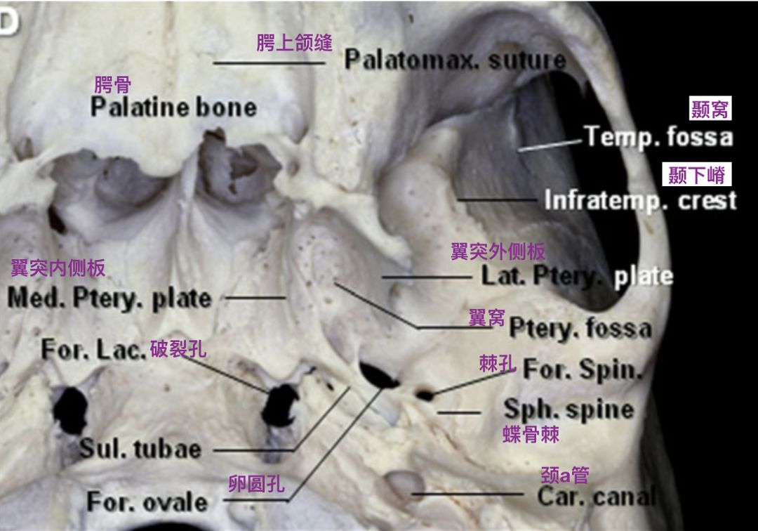 颞下窝下面观(Joo 2013)。咽鼓管沟,是咽鼓管的软骨部分附着于颅底的位置,位于蝶岩骨裂的颅外面,破裂孔的前外侧,卵圆孔和棘孔的后内侧。卵圆孔位于翼突外侧板的上端后缘。