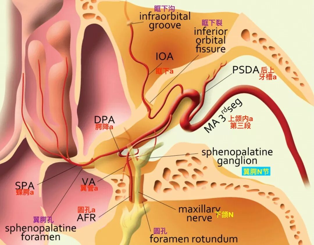 右侧翼腭窝解剖模式图,上面观(Tanoue 2013)。上颌内动脉位于翼腭窝内,紧邻翼腭神经节。通过翼腭窝,上颌内动脉分支至眼眶,鼻腔,鼻咽,海绵窦和颈动脉管。