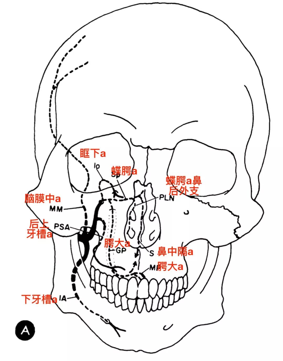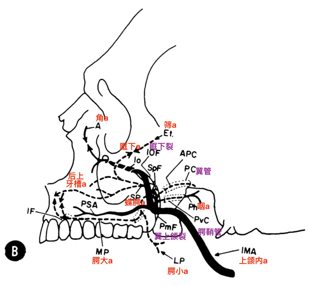 上颌内动脉翼腭段分支及主要的供血范围(Alvernia 2017)。