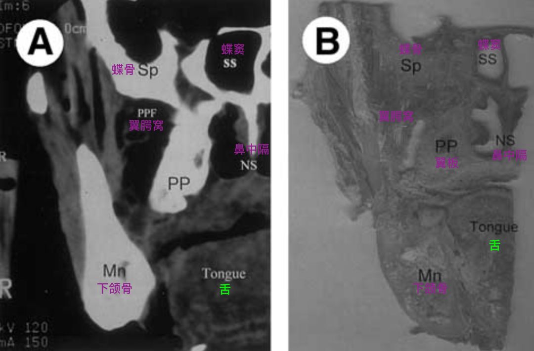尸体翼腭窝区冠状面CT(A)和解剖(B)对比(Choi 2003)。