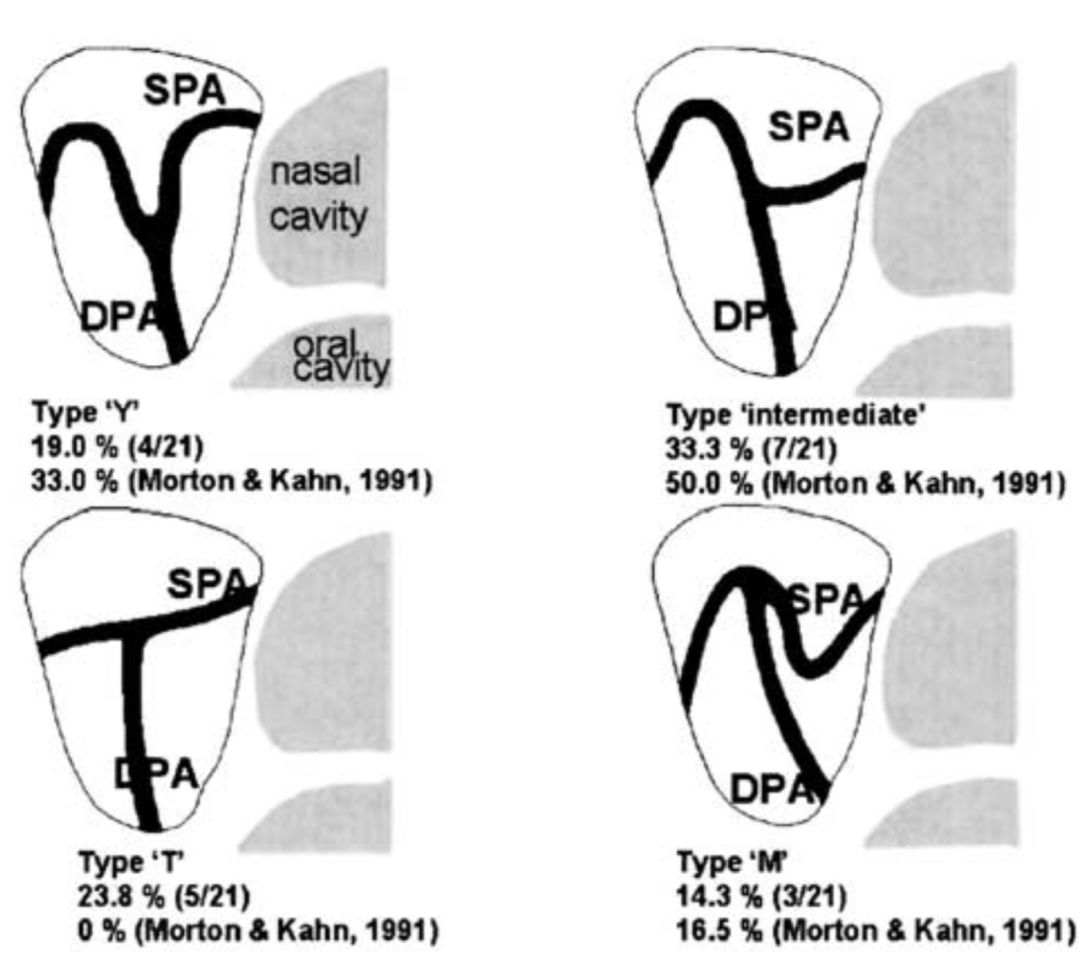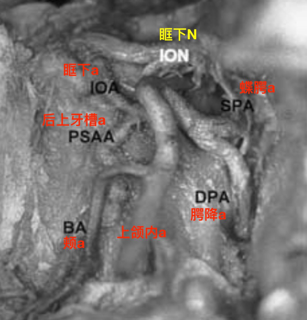 但是,也有不同的变异。比如说颊动脉在后上牙槽动脉起始部远端发出(Choi 2003);后上牙槽动脉和眶下动脉共干等(Choi 2003)。