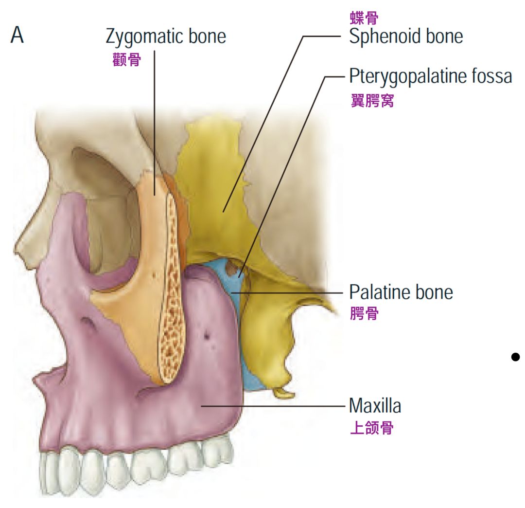 去除下颌骨,切除颧弓后,显示翼腭窝(Standring, 2016)。翼腭窝主要是由上颌骨、颧骨、蝶骨和腭骨围成的。