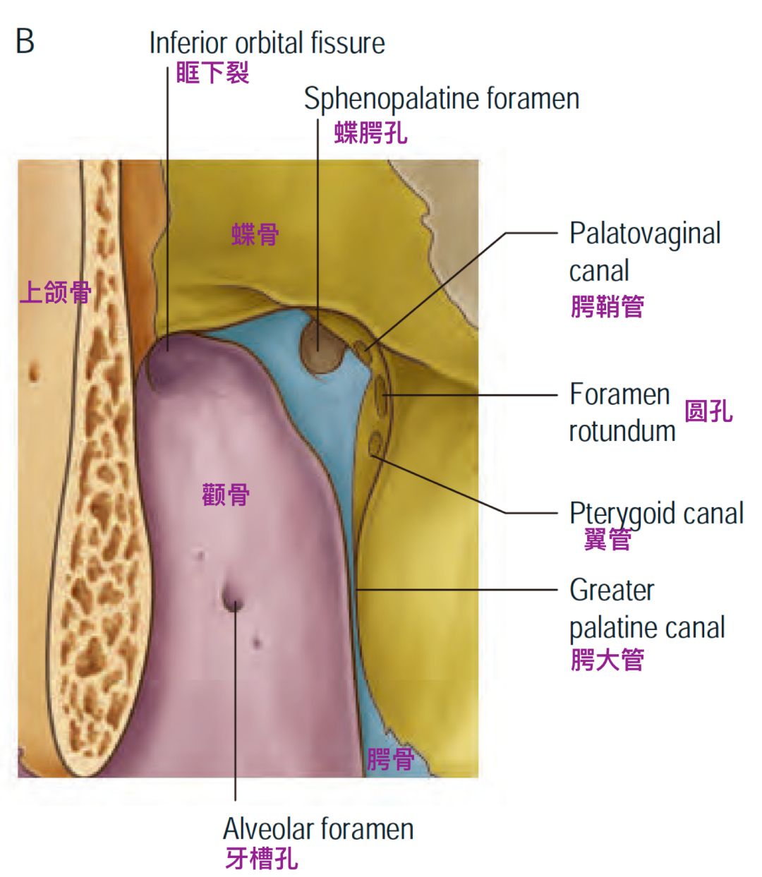 翼腭窝后壁有三个开口:① 圆孔(foramen rotundum),内有上颌神经;② 翼管(pterygoid canal),又称Vidian管(Vidian canal),内有翼管神经;③ 腭鞘管(palatinovaginal canal),又称咽管(pharyngeal canal),内有腭鞘动脉走行。