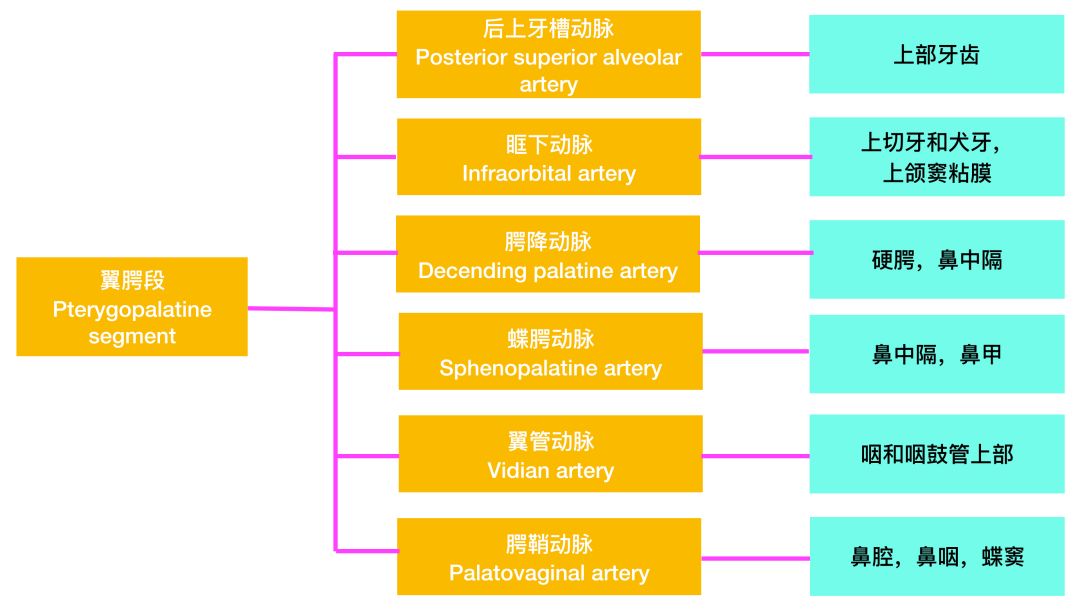 上颌内动脉翼腭段的分支主要包括:后上牙槽动脉,眶下动脉,翼管动脉,腭鞘动脉,腭降动脉和蝶腭动脉。