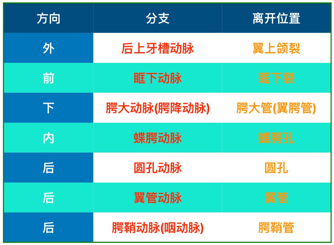 上颌内动脉经翼上颌裂进入翼腭窝,延续为上颌内动脉的第三段(翼腭段)。此翼腭窝内,分出多个分支,供应面部深部结构。