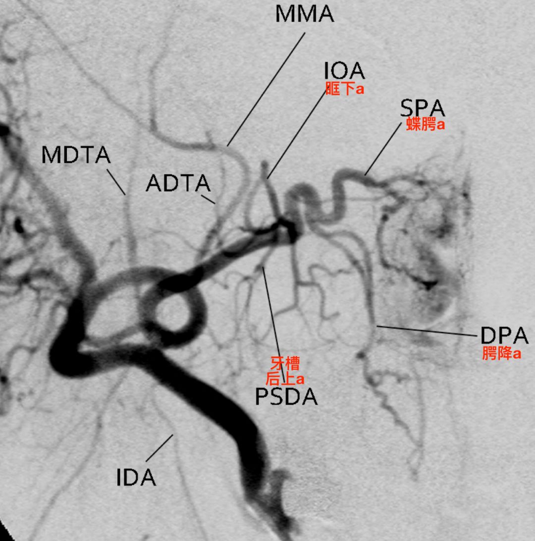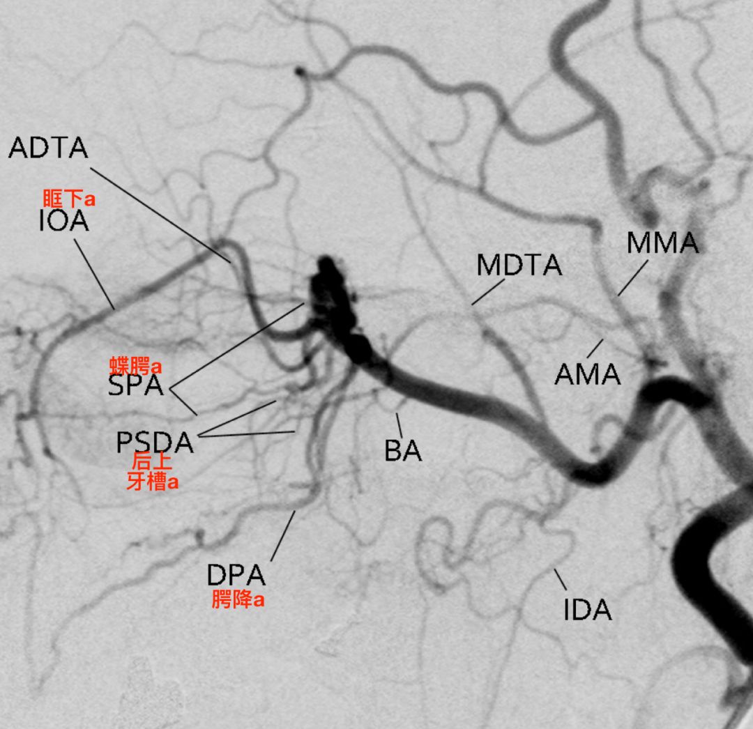 颈外动脉造影,正位,显示上颌内动脉第三段分支(Tanoue 2013)。上颌内动脉第三段的分支在正位上更容易辨认。