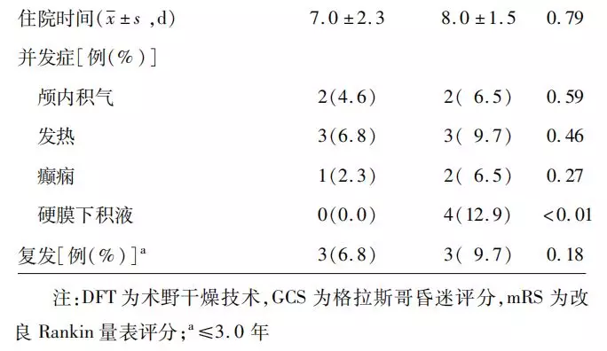 1.手术疗效:由表1可见,DFT组平均手术时间短于非DFT组,差异有统计学意义(P<0.01);术后第1天平均血肿清除率、引流管留置时间及住院时间,两组差异均无统计学意义(P>0.05);DFT组随访0.5~3.5年,非DFT组随访1.5~7.0年,≤3.0年时两组的复发率差异无统计学意义(P>0.05)。