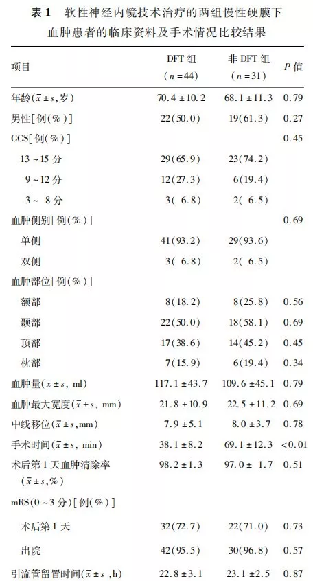 1.临床资料(表1):回顾性连续纳入2015年1月至2018年1月采用软性神经内镜结合DFT治疗的CSDH患者44例(DFT组);另外选择性纳入2011年1月至2014年12月采用单纯软性神经内镜治疗的CSDH 患者31例(非DFT组)。两组患者的年龄、性别、血肿量、位置等基线资料的差异均无统计学意义(均P>0.05,表1)。入组标准:(1)患者均符合CSDH的诊断标准[1];(2)未曾口服他汀类药物治疗CSDH;(3)口服抗凝药物停药10d以上;(4)非复发性CSDH。