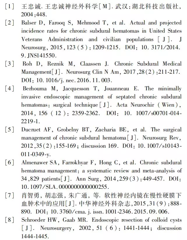 神外资讯【中华神外】专栏,每周发布一篇精选文章,今天刊登的是由关峰、胡志强、彭伟澄、黄辉、戴缤、朱广通、毛贝贝、肖智勇、林镇阳在《中华神经外科杂志》2019年第四期“神经内镜”上发表的“软性神经内镜结合术野干燥技术治疗慢性硬膜下血肿”,欢迎阅读。