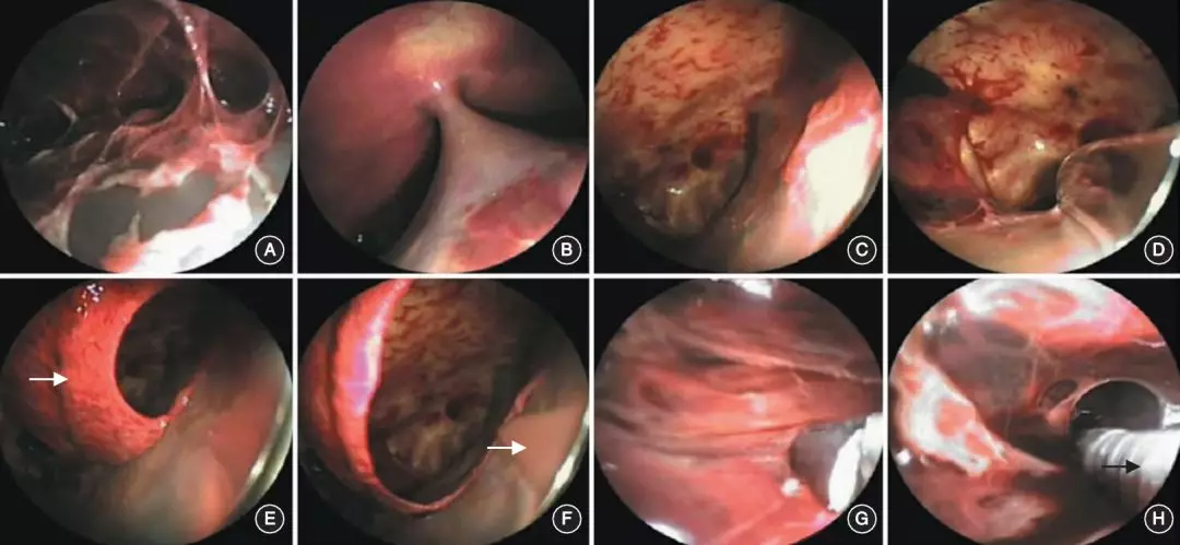 图1. 软性神经内镜结合术野干燥技术治疗慢性硬膜下血肿患者术中所见 A.血肿腔内布满条索和分隔;B.血肿腔内可见粗大的桥静脉;C,D.探查血肿边界并局部冲洗置换残存血液;E.可见血肿腔内假性分隔(箭头所示);F.术中采取局部冲洗(箭头所示)的方法清除假性分隔内的残存血液;G.可见血肿腔内真性分隔;H.神经内镜结合术野干燥技术下采用抓钳(箭头所示)贯通分隔后可见有暗红色的血性液体流出。