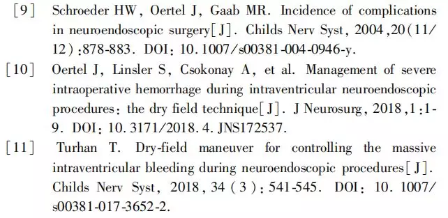 (3)术中止血是内镜神经外科手术过程中面临的主要问题[5]。采取DFT,术者在空气介质下操作,不必担心出血影响术野观察,能够更加清晰地观察出血部位和责任血管,有助于术者掌控手术局面和妥善止血。