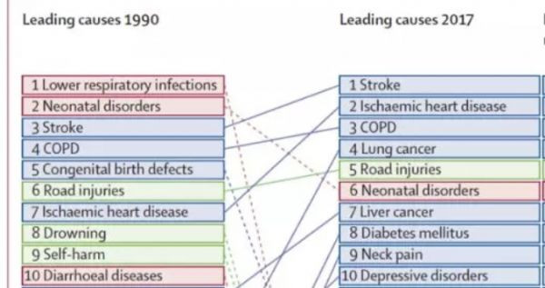 2017年中风、缺血性心脏病和慢阻肺是国人死亡的前三位杀手,其次是肺癌、道路交通意外伤害、新生儿死亡、肝癌、糖尿病、颈部疼痛和抑郁障碍。