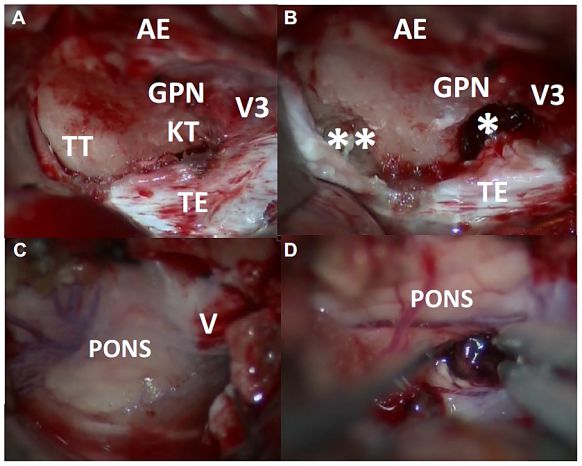 图2. 术中发现:A.将覆盖在KT和TT上的硬膜切开并从岩骨上剥离,清楚显示两个三角;B.磨除KT(*)和TT(**)骨质;C.显露桥脑前外侧面和三叉神经;D.切开桥脑清除血肿。AE:弓状隆起;GPN:岩浅大神经;TE:小脑幕;V:三叉神经;V3:下颌神经。