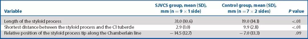 表1. SJVCS与对照组患者茎突解剖学参数对比。