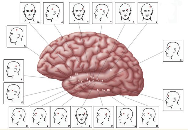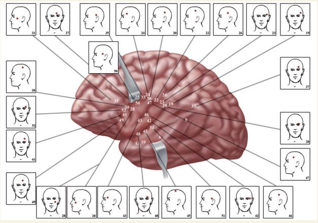 图3. 左侧大脑侧面图,显示颞叶的疼痛敏感结构部位及其编号,与脸面部相对应的疼痛部位。