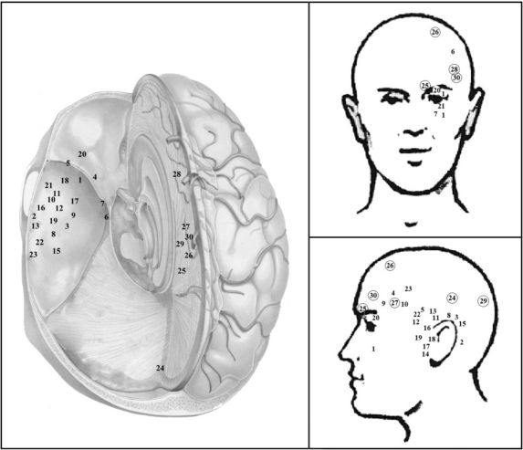 图2. 刺激硬脑膜发生头痛事件。左图:颅底硬脑膜和大脑镰;数字表示机械刺激引起疼痛的痛觉敏感结构部位。右图:相对应的脸面部疼痛部位编号。带圆圈数字对应大脑镰的刺激部位。14号位于额部凸面的硬脑膜上(未显示)。