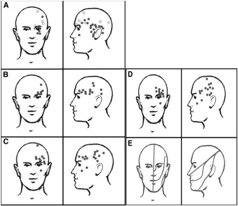 图1. 机械刺激颅内结构时,于脸面部相对应的疼痛部位。A.灰点是刺激颅底硬脑膜时的对应痛点和白点是刺激小脑幕时的对应痛点;B.刺激额叶和顶叶沟内的软脑膜和小血管时的对应痛点;C.刺激颞叶沟内的软脑膜和小血管时的对应痛点;D.刺激外侧裂和岛状沟内的软脑膜和小血管以及大脑外侧面区域,包括颞叶和额叶时的对应痛点;E.三叉神经眼支、上颌支和下颌支支配的面部区域。