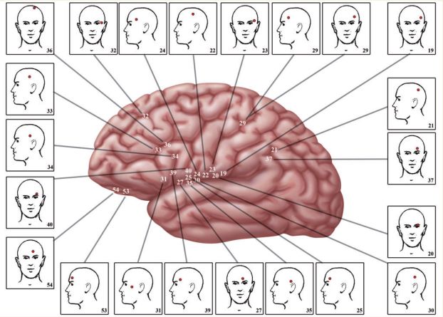 图4. 左侧大脑侧面图,显示额叶和顶叶的疼痛敏感结构部位及其编号,与脸面部相对应的疼痛部位。数字53和54位于额叶直回上。