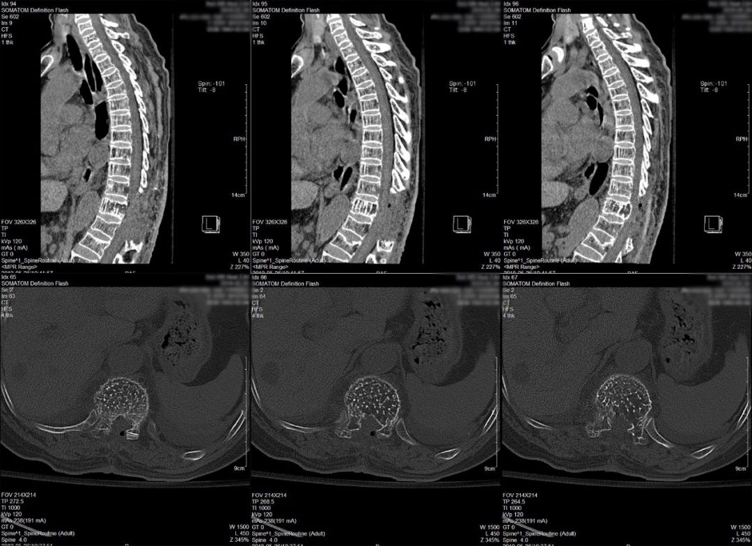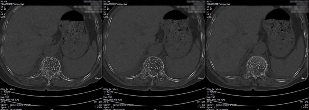 图2.术前胸椎CT平扫见胸11蜂窝样改变,提示血管瘤可能。