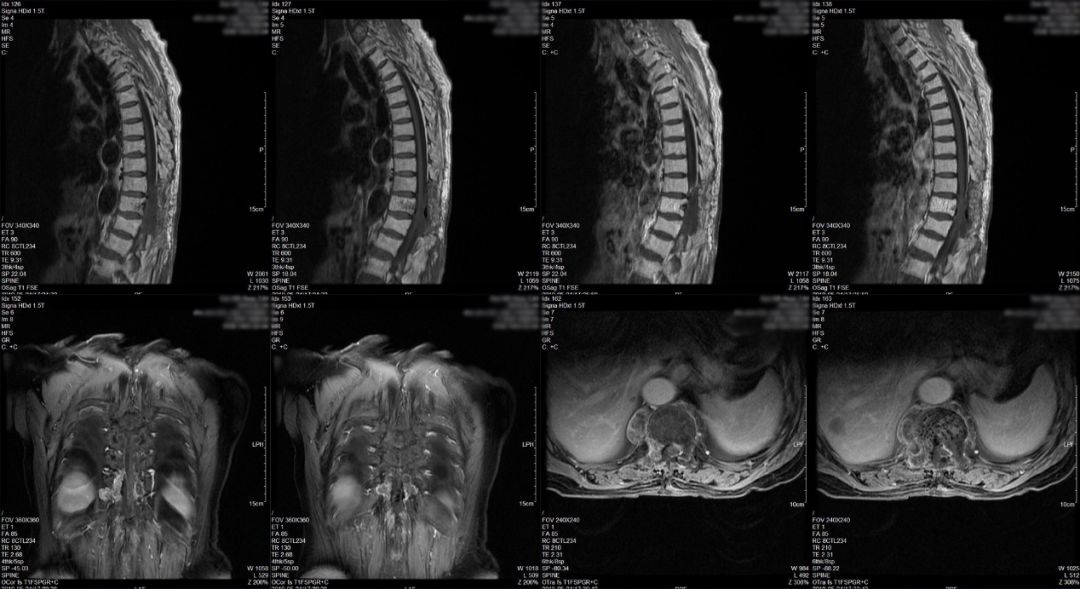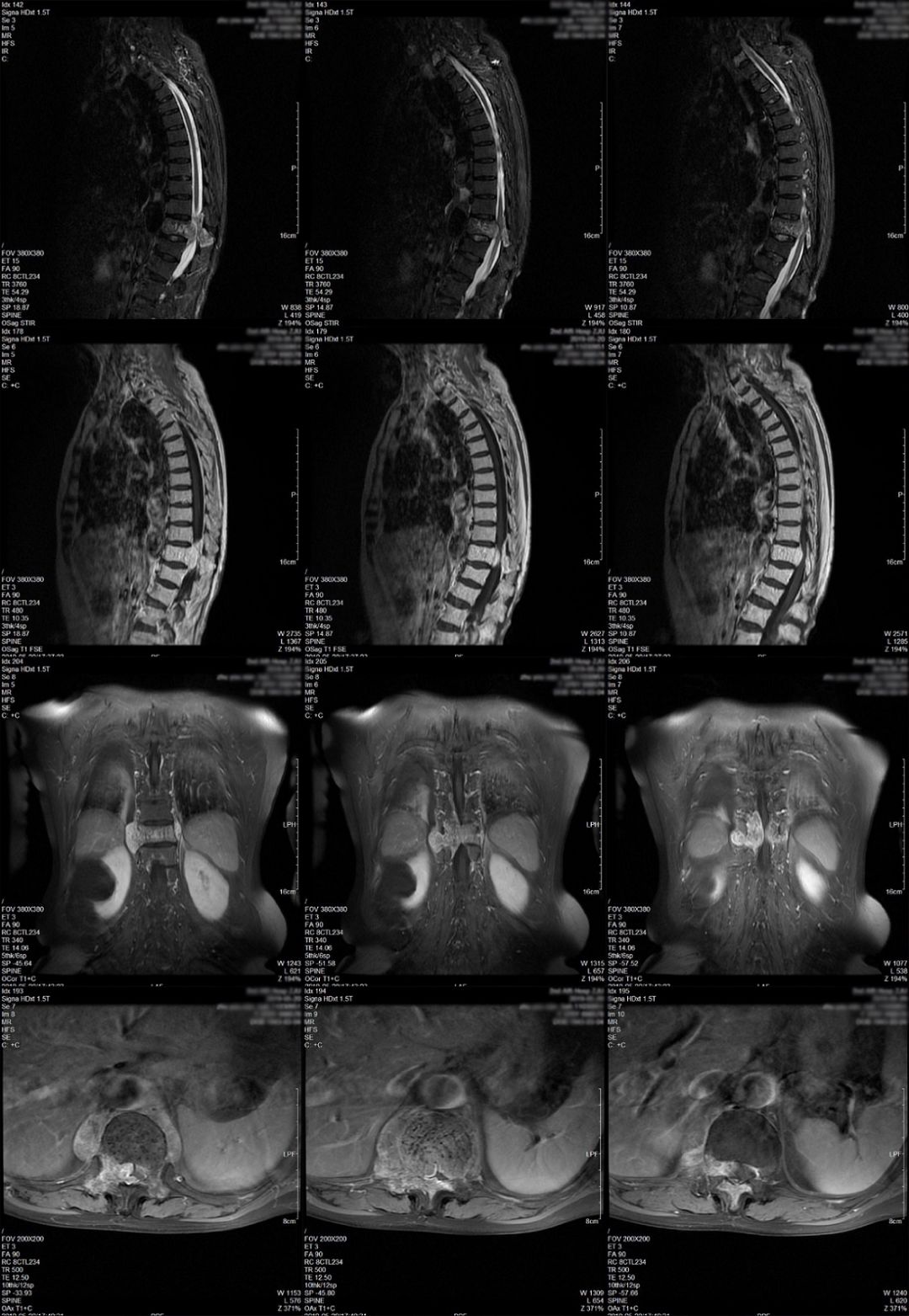 图1.术前胸椎增强MRI检查提示胸11及颈7病变,考虑血管瘤可能,转移性肿瘤待排。胸11病变继发病理性骨折,椎管狭窄,脊髓受压。