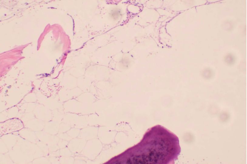 手术过程:患者俯卧位,以胸11为中心取约10cm直切口,切开皮肤,剥离两侧椎旁肌肉,暴露胸10-11棘突及椎板,见胸11两侧椎板皮质表面虫蚀状血窦出血,以铣刀由相对正常的区域开始快速铣下胸10-11椎板及棘突,见暗红色出血汹涌,以骨蜡封闭骨缘学窦、电凝静脉丛迅速止血,探查显露硬脊膜,肿瘤占位于硬膜右侧及前方,灰红色有较完整包膜,与硬脊膜边界尚清晰,包膜内丰富海绵血窦样结构,边电凝烧灼边分块切除,直至椎体后缘,瘤体血供与椎体血窦相通,以骨蜡填塞及流体明胶止血并清理创面,见硬膜减压充分,局部无明显活动性渗血后,留置皮下负压引流管一根,逐层缝合肌肉及皮肤。手术结束,术中出血300ml左右,未输血。术后手术标本送常规病理。