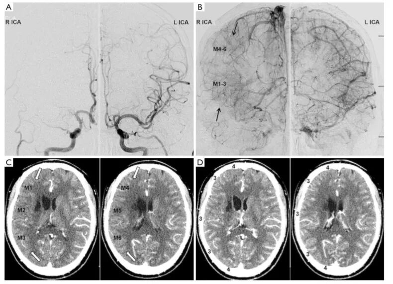 图4. 侧枝代偿两种分级比较。22岁男性单侧烟雾病患者。双侧颈内动脉DSA的动脉期(A)和静脉期(B),显示右侧大脑中动脉延时显影(箭头,M1-6,3级);CTP-Sis分级:动脉期(C)中度强化(M1-6),静脉期(D)完全强化。白色箭头表示低灌注区域。患者侧枝代偿两种分级结果一致。
