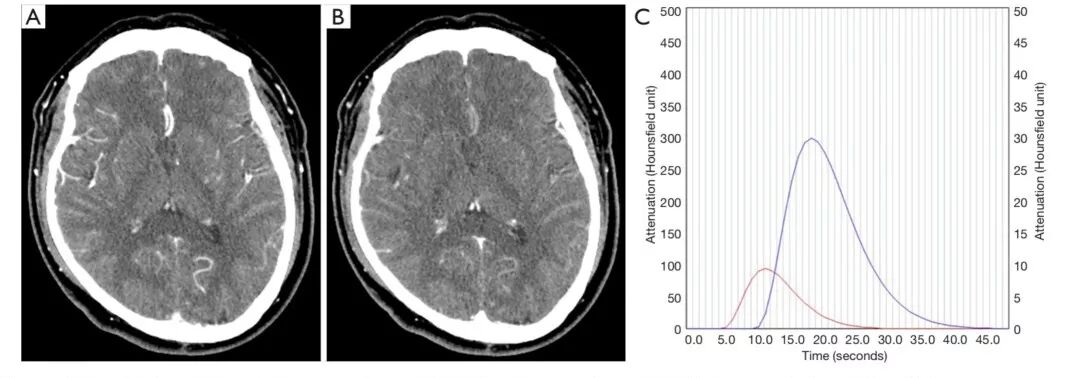 图1. CTP动脉期和静脉期的原始图像。A.CTP动脉期原始图像;B.CTP静脉期原始图像;C.CTP动脉期和CTP静脉期的时间--密度曲线(TAC);水平轴表示时间(秒),垂直轴代表密度。采集时间50秒,每秒对应一副图像。所示病例中,扫描开始后12秒时动脉期时间--密度曲线达到峰值,12秒定为动脉期。19秒时静脉期时间--密度曲线达峰值,19秒定为静脉期。