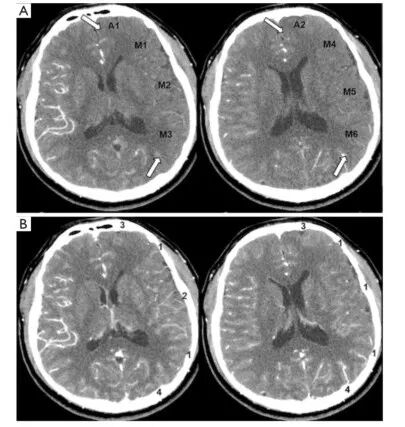图3. 1例37岁男性患者,单侧烟雾病的CTP-Sis评分。A为动脉期,B为静脉期,箭头所指为低灌注区。