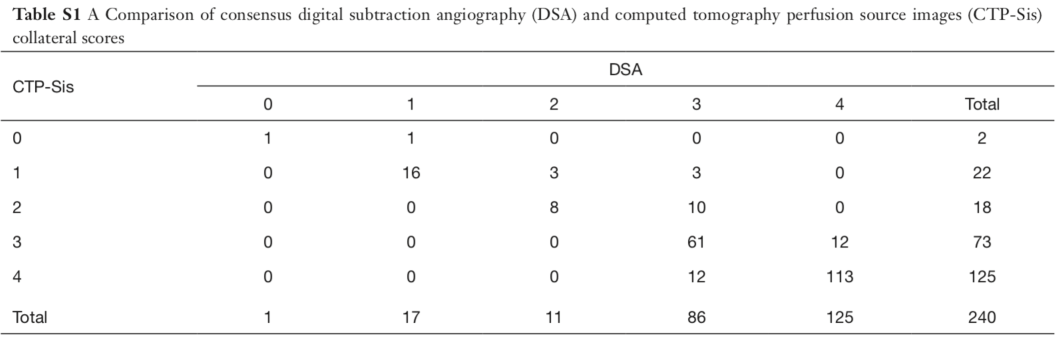 该研究建立评估侧枝代偿的CTP-Sis分级系统。CTP原始图像可以提供类似DSA的动脉期、实质期和静脉期的图像;根据侧枝循环到达缺血区的速度和程度进行分级,与DSA分级有较高的一致性。由于CTP-Sis分级侧重于软脑膜侧枝代偿,可能因存在皮质下白质病变或梗死,所以对某些DSA分级为3级的区域评分偏低。