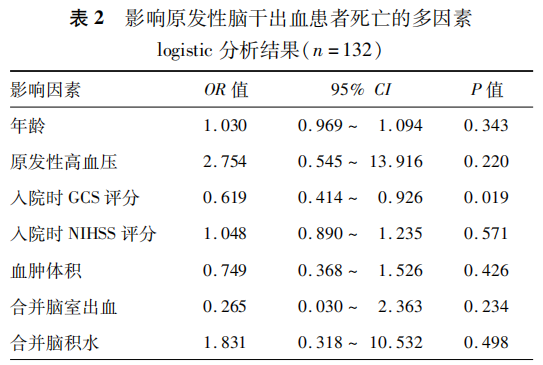 探讨引发原发性脑干出血患者死亡的独立危险因素。