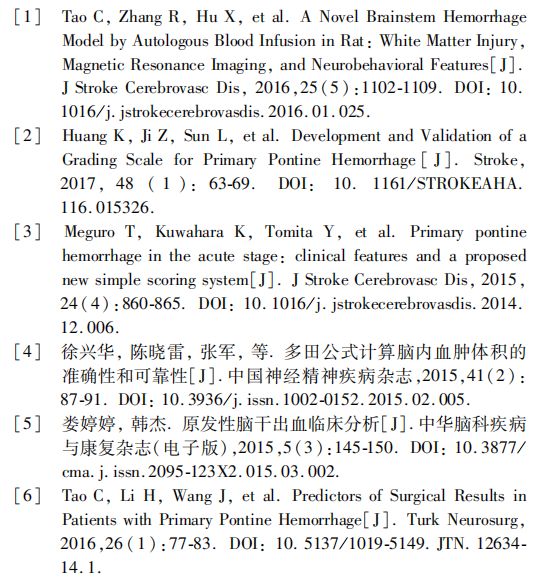 2.纳入标准和排除标准:纳入标准为头颅CT或CT血管成像(CTA)诊断出血部位位于脑干,年龄≥18岁;患者或家属知情同意并签属知情同意书。排除颅脑外伤、颅内动脉瘤、颅内动静脉畸形、颅内肿瘤等所致的颅内出血及小脑出血,且年龄<18岁的患者。