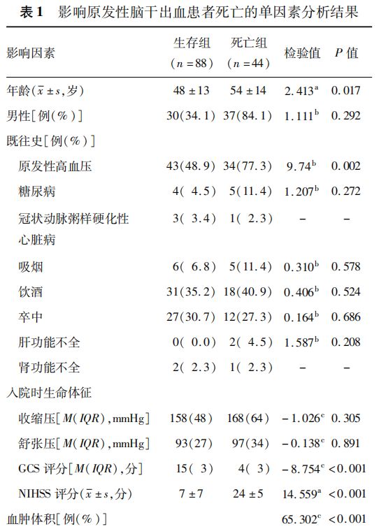 回顾性纳入2000年1月至2016年12月陆军军医大学西南医院神经外科收治的132例(存活88例,死亡44例)原发性脑干出血患者。采用卡方或秩和检验对患者的年龄、性别、既往史、入院时生命体征、血肿体积等相关危险因素进行单因素分析,明确原发性脑干出血患者发病后30d存活的危险因素;进一步采用多因素logistic回归分析,明确引发原发性脑干出血患者死亡的独立危险因素。