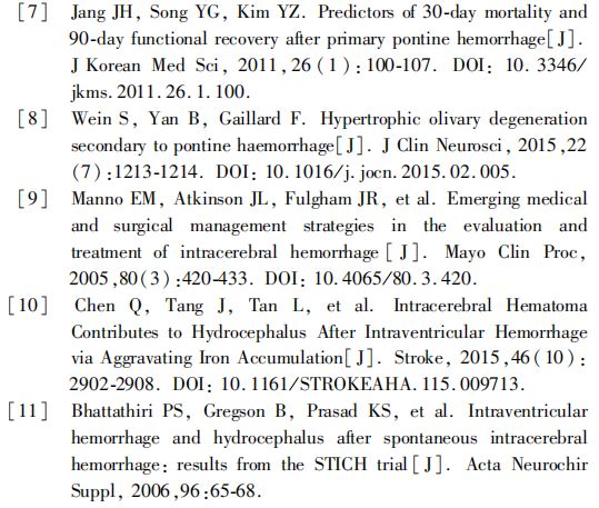 研究原发性脑干出血的危险因素可用于后期指导临床治疗。原发性脑干出血的治疗分为手术治疗和保守治疗,目前其治疗方式的选择仍存在较大争议[9]。而原发性脑干出血后血液及其代谢产物对神经组织的毒性作用,尤其是伴发脑室出血的患者,本课题组通过基础研究证实,脑出血破入脑室后可引起继发性脑积水,并对实验动物的预后产生不良影响[10]。临床研究结果表明,血液及其代谢产物长期滞留于颅内可刺激脑组织,造成神经细胞的丢失和铁代谢失衡,进而影响患者的生存质量[11]。因此,原发性脑干出血患者治疗方式的选择,不仅需考虑患者的出血量及全身状况,还应重视合并脑积水情况的处理,及时行脑室外引流术(或安置Ommaya囊),以缓解脑积水,提高患者的生存质量。