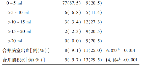 4.治疗方法:分为手术治疗(24例)及保守治疗(108例)。手术治疗包括脑室外引流术(9例)和开颅血肿清除术(15例)。脑室外引流术的适应证为发病后即出现脑积水或合并脑室出血且家属要求积极治疗的患者;开颅血肿清除术的适应证为GCS评分3~8分、家属强烈要求手术、出血量为10~15ml的患者。保守治疗的适应证为GCS评分3~8分、家属放弃手术治疗、发病后即刻出现脑疝、GCS评分为12~15分并经多次CT复查血肿体积稳定、血肿体积<5ml的患者,治疗方式主要为脱水、营养神经及对症治疗等。