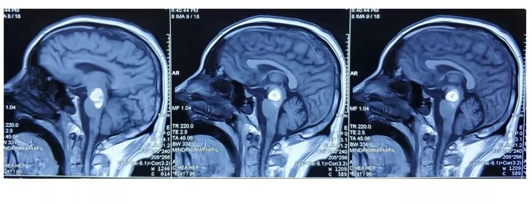 术前诊断:三脑室内囊肿,幕上脑积水。