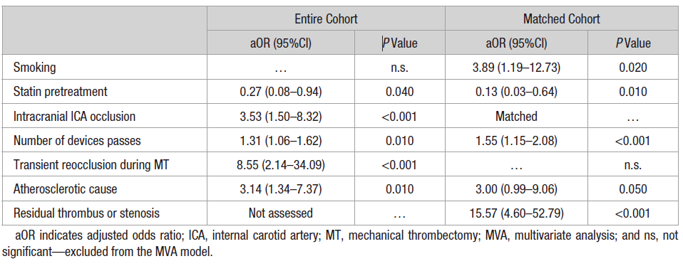 结果显示,研究共纳入473例成功再通患者中的423例(89%)患者,其中28例(6.6%)患者24小时发生再闭塞。多变量分析结果提示,入院前他汀类药物治疗(aOR: 0.27,95%CI: 0.08-0.94)、颈内动脉颅内段闭塞(aOR: 3.53, 95%CI:1.50-8.32)、通过次数(aOR: 1.31, 95%CI: 1.06-1.62)、MT期间短暂性再闭塞(aOR: 8.55, 95%CI: 2.14-34.09)和存在动脉粥样硬化病因(aOR: 3.14, 95%CI: 1.34-7.37)与再闭塞存在独立相关性(表1)。在匹配队列分析中,与未发生再闭塞的患者相比,随后发生再闭塞的患者在再通后血管造影图像上出现残余血栓或狭窄的频率更高(71.4% vs 20.5%)。多变量分析提示残余血栓或狭窄与再闭塞相关(aOR:15.6, 95%CI: 4.6-52.8)。发生再闭塞的患者与早期神经功能恶化相关,但与脑实质血肿或症状性出血性转化无关,发生再闭塞的患者具有较差的结局(aOR: 5.0, 95%CI: 1.2-20.0)。