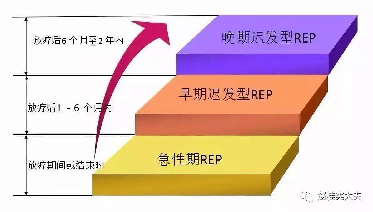 依据各种不同症状的发生时间,放射性脑损伤可分为三期:急性期、早期迟发反应期(早迟发期)和晚期迟发反应期(晚迟发期)。