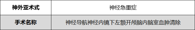 该病例为左侧基底节血肿破入脑室,出血量较大。患者昏迷,脑疝形成。CT显示脑室系统血肿铸型,四脑室明显扩张,提示脑室内压力较高,合并急性梗阻性脑积水。CTA显示“烟雾病”和“左侧基底节血肿内异常血管影”。根据病情和影像学检查,选择急诊开颅手术快速清除血肿比双侧脑室穿刺置管外引流更加安全和有效。开颅血肿清除手术主要为显微镜手术和内镜手术。该患者脑出血特点以脑室内血肿为主,且几乎涉及全脑室系统。术者制定手术策略非常专业和富有经验:1、选择内镜手术,可充分发挥内镜在脑深部血肿和脑室内血肿清除术中视野广,手术方向调整范围大;可抵近观察,深部照明无遮挡,术野暴露清晰的优势。2、选择额叶入路,与颞叶入路相比,额叶入路可避免和减少对脑纵向纤维束的损伤。手术方向与血肿和脑室长径同轴,可方便最大程度清除脑内和脑室内血肿。3、选择小骨窗开颅不行外减压术。术者已考虑到该患者脑内血肿不大,原发脑损伤程度不重,早期脑疝与脑室内血肿和梗阻性积水导致的急性颅内压增高有关,血肿清除后出现持续高颅压概率较小。