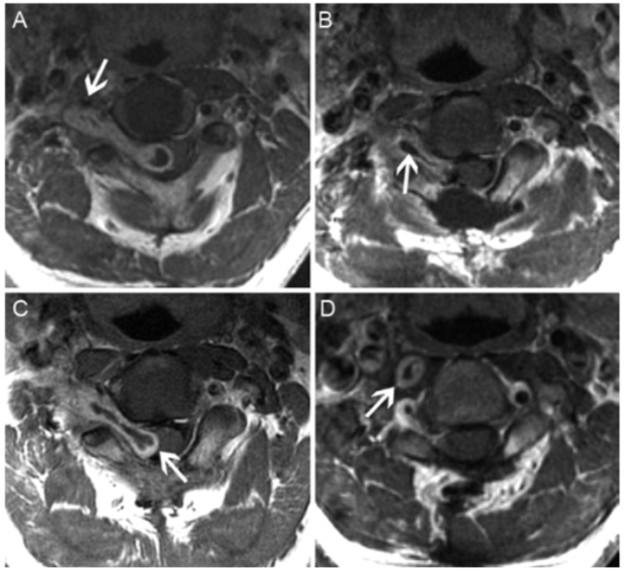 图1. 1例患者MRI资料。A.术前MRI-T1加权轴向位增强图像显示,C2-3处哑铃状肿块,于硬膜下和硬膜外生长并向椎旁延伸(Eden II型);椎动脉(箭头)受肿瘤挤压,动脉周围受累区<180°。B.手术后1周的MRI-T1加权轴向位增强图像显示,右侧C2-3残余肿块中心坏死(箭头)。C.手术后5个月MRI图像显示,残余肿瘤(箭头)增大,突入椎管压迫脊髓。D.第二次手术后9个月MRI图像示,位于椎体右前方的增强的残余病变(箭头)。