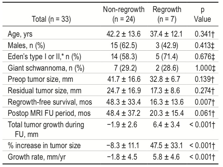 90例患者中,51例(56.7%)男性和39例(43.3%)女性;年龄7-77岁,平均44.5岁。其中哑铃状肿瘤62例(68.9%);全切除59例(65.6%)。28例非哑铃状肿瘤均做到GTR。在术后150个月的随访期间,GTR组仅1例复发,MRI表现肿瘤逐渐增加(8.9mm)。次全切除组的复发患者,在20.3个月的随访期间,肿瘤大小的平均增加百分比为47.5%±33.1%,平均生长速率为每年5.8±4.6mm。然而,对无肿瘤再生长患者的48.4个月随访期间,残留肿瘤的大小自然缩小8.3%±11.1%(图1)(表1)。